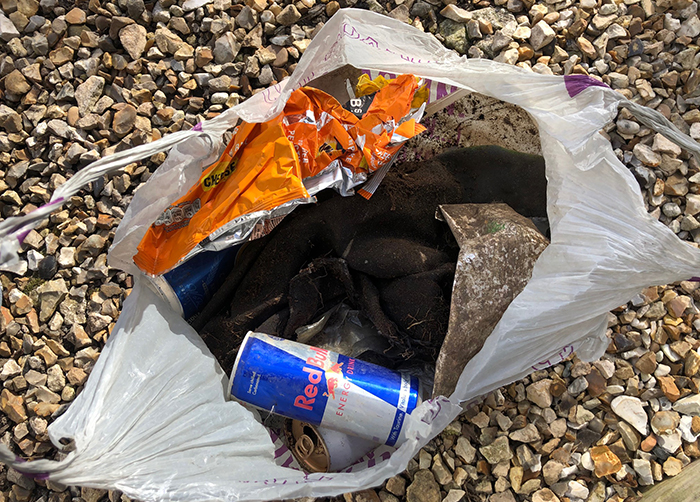 Rubbish found: metal cans (Red Bull, Fosters, Stella Artois), crisp packs (Mini Cheddars), plastic bottle (Lucozade), sweets wrappers (Cadburys), broken plastic pieces.