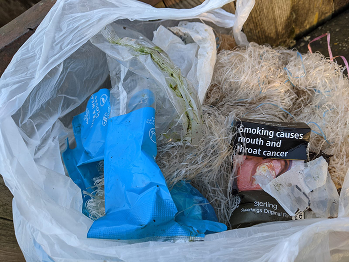 Rubbish picked up in Thorney today by our regular litter pickers Ann & Bernard. They walk round Thorney every day picking up a small amount of litter every day. Today’s rubbish included blue wrappers for disposable plastic gloves, a cigarette packet (Sterling) plus a quantity of plastic netting.