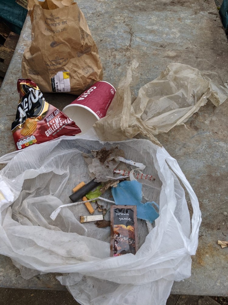 Rubbish picked up in Thorney by their excellent litter pickers Bernard and Anne. It included bits of plastic, a Costa cup, a crisp packet, 4 cigarette butts, Morrisons paper bag with a half eater pork pie inside and an unopened packet of brown sauce!
